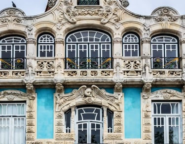 Aqui, a Arte Nova surge integrada na arquitetura urbana, revelando-se nos detalhes.